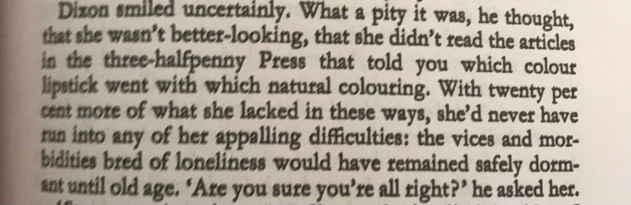 Jim Dixon i Lucky Jim er temmelig sexistisk. Men hva kan man forvente? ble det sagt i forordet av David Lodge. Romanen ble tross alt publisert for første gang i 1954. Stemmer dette, må jeg bare godta sexisme hvis jeg skal lese en eldre roman? Hvor ny må en roman være for at jeg ikke skal måtte forvente sexisme? Opprinnelig hadde jeg tenkt å ha som litterært nyttårsforsett ikke bare å lese 44 menn, men også bare lese bøker fra før år 2000, men det måtte jeg trekke tilbake da jeg innså at dersom jeg skal lese så mange bøker skrevet av menn, trenger jeg alle mulige bøker å velge fra, jeg trenger ikke enda en innskrenkning. Jeg tror det var en klok avgjørelse, selv om jeg vet at det finnes masse sexisme også i samtidslitteraturen. (Men da er det liksom greit å påpeke det, hvis vi skal følge logikken til David Lodge.)